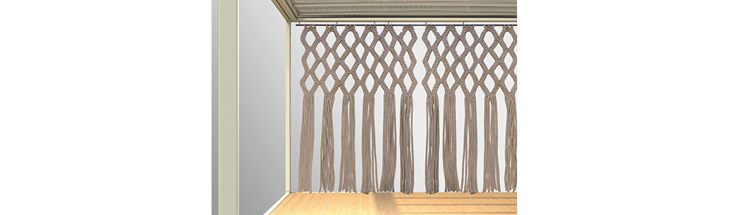 The pavilion can be closed on each side by interwoven polypropylene curtains available in two colors. The fringes in synthetic rope take up the traditional workings of lace, creating suggestive graphic effects and plays of shadows.
