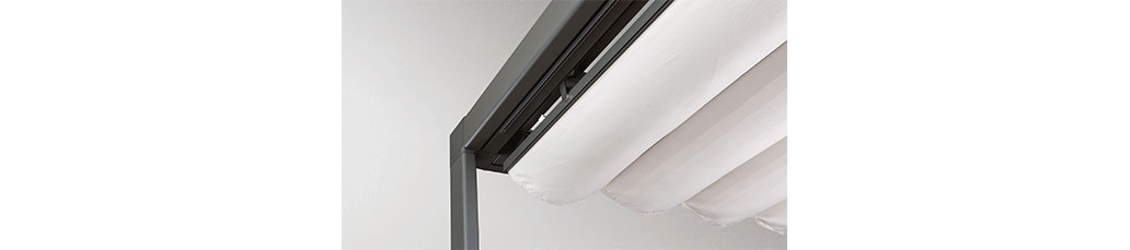 The pavilion can be closed on all sides thanks to acrylic curtains available in four colours.